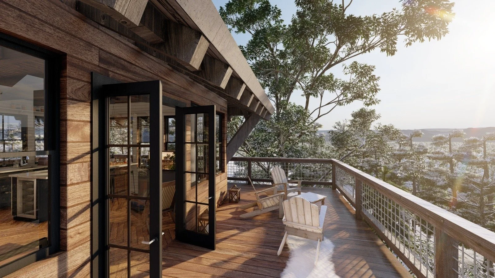 The middle Level deck provides visitors with an open space for a Hot Tub, lounge and seating area as well as refreshment bar and fire pit to create the perfect stay. Optional Off the grid solar packages, Entertainment and furniture packages are always good to look at.